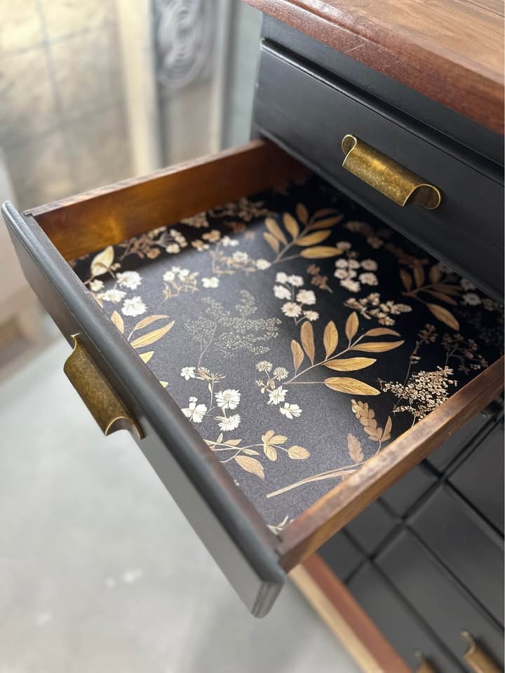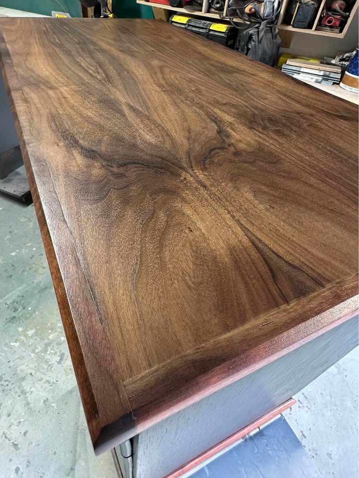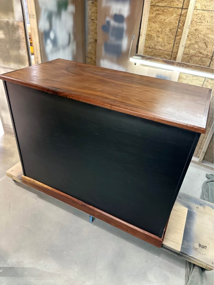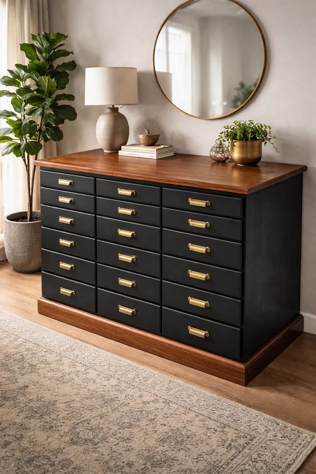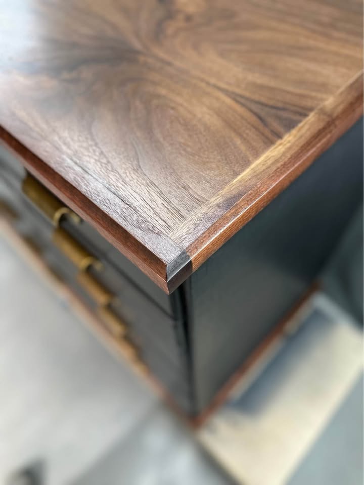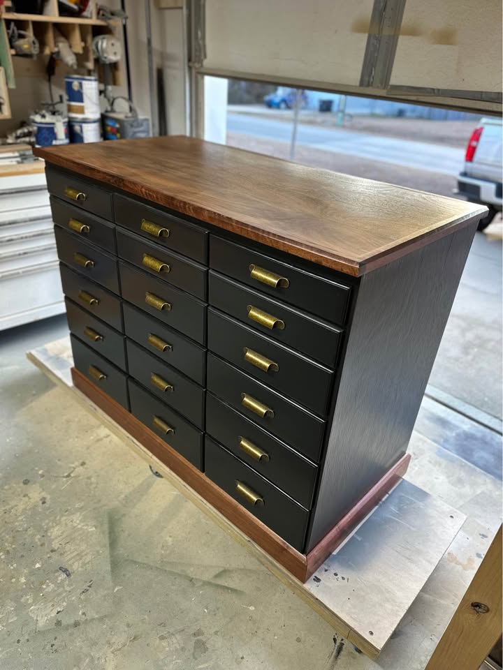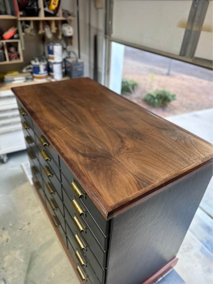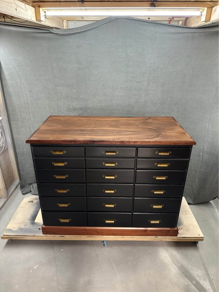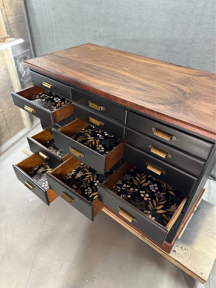 This Apothecary / Haberdashery cabinet is from Colonial Revival period of furniture making. It has been tastefully refreshed for the modern era, but maintains its vintage charm. I personally crafted the Walnut top and base trim for this piece. The top is built from solid hardwood, including bookmatched, premium Grade A walnut veneer over solid maple as well as solid walnut breadboards. I also crafted the solid walnut plinth-style trim that wraps the bottom of the cabinet. The walnut itself shows beautiful grain movement, with soft cathedral figuring and rich heartwood tones that mirror the top above. That repetition creates visual symmetry from floor to crown, giving the piece a cohesive, custom-built appearance.
