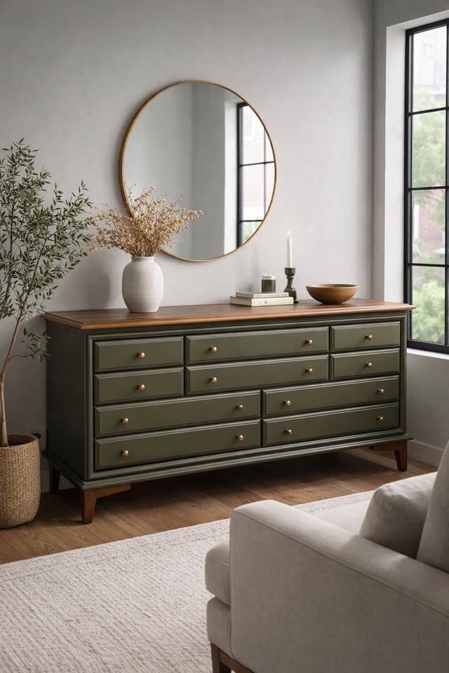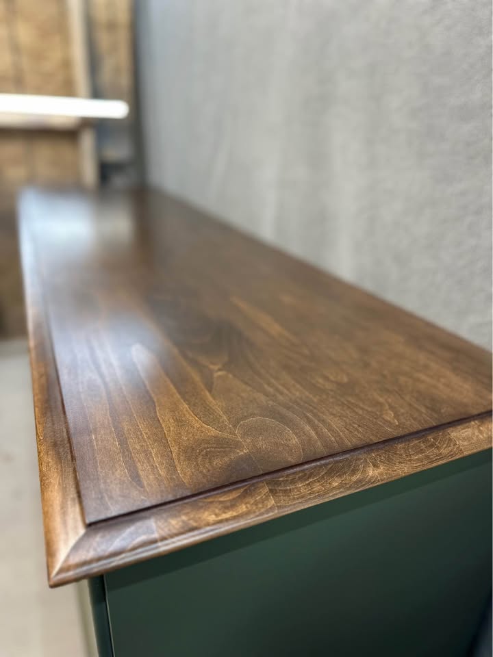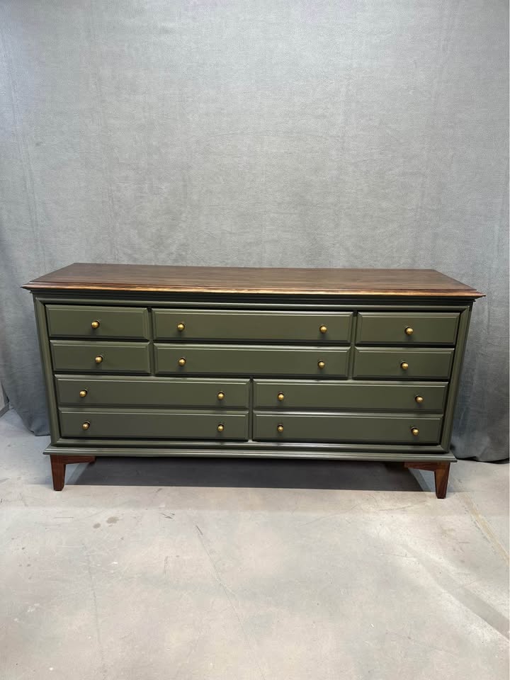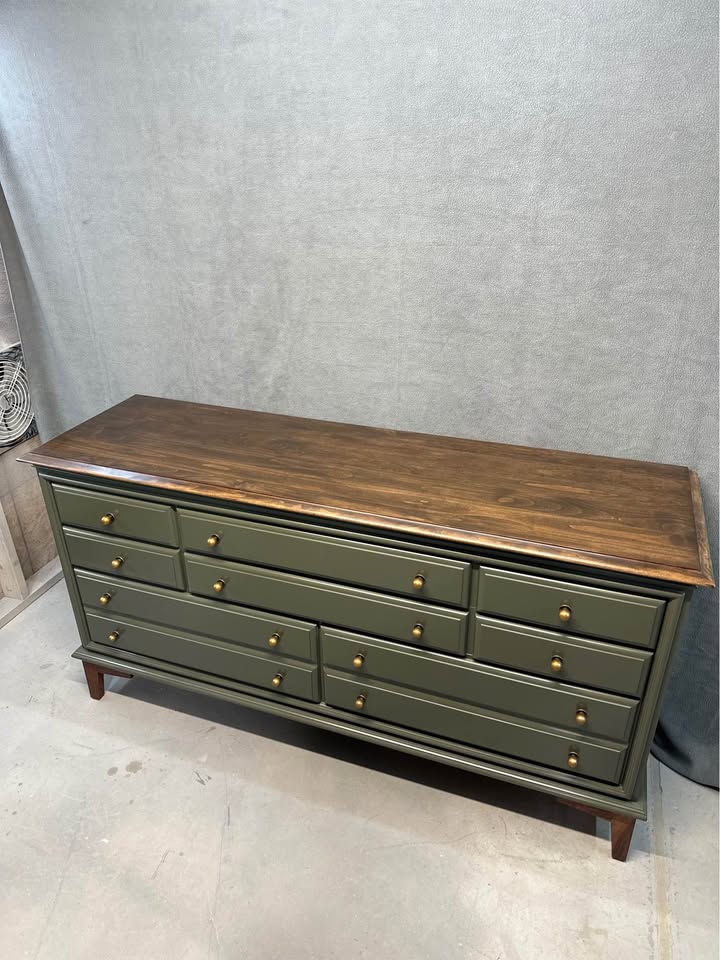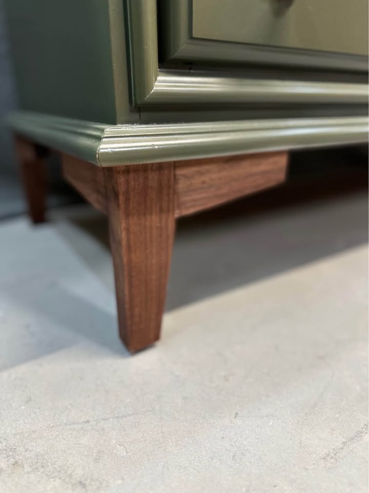 Solid wood, Dark Olive and Antique Brass, Maple and Walnut, Custom built Mid Century base, Dovetailed drawer construction